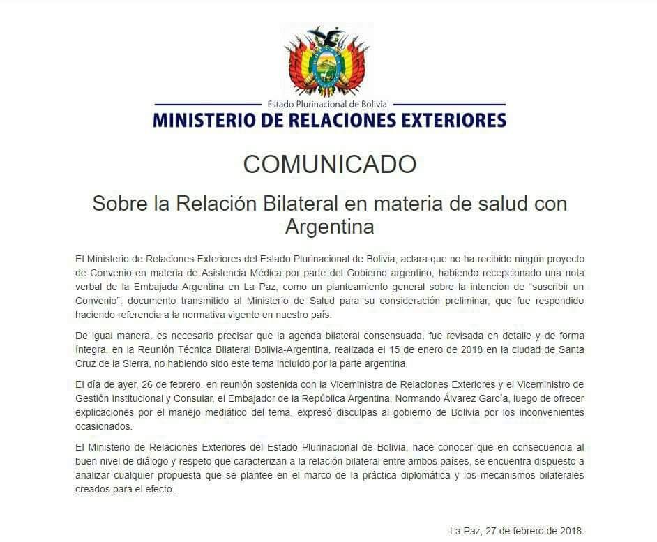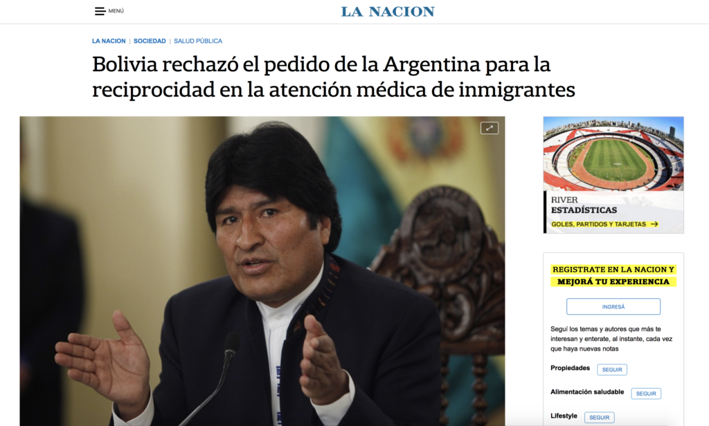 Desde temprano La Nación publicó en su portal, y otros medios lo replicaron durante todo el día, que “Bolivia rechazó el pedido de la Argentina para la reciprocidad en la atención médica de inmigrantes”. Y dio cuenta de una nota enviada por la Embajada de Argentina en la que proponía al país vecino la firma de un Convenio para alcanzar la reciprocidad. Publicó también parte de un comunicado de la Cancillería boliviana en el que el Ministerio señaló que se efectuaron las consultas pertinentes al Ministerio de Salud y especificaron que se tienen como beneficiarios de la atención integral y protección financiera de salud a todos los nacionales y estantes del territorio nacional que no cuenten con algún seguro de salud y que estén comprendidos dentro de 5 grupos: mujeres embarazadas hasta los 6 meses posteriores al parto; menores de 5 años; mayores de 60; mujeres en edad fértil respecto de la atención sexual y reproductiva y discapacitados.