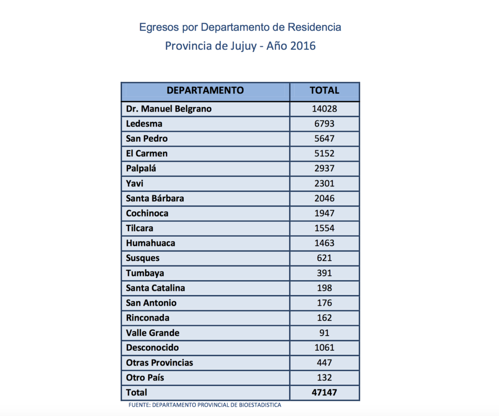 De los datos de acceso público, el último registro es de 2016 (http://salud.jujuy.gob.ar/wp-content/uploads/sites/14/2018/01/ANUARIO_EstHosp_2016.pdf). En el anuario de ese año especifica que de un total de 47147 egresos de hospitales de la provincia por departamento de residencia, solo 132 son de “otros países”, aunque tampoco detalla cuáles. En 2015 la cifra fue similar: de 49905 egresos, 193 eran extranjeros. Si se prefiere considerar el número brindado por Mulqui que aseguró que en tres años se atendieron en el sistema público de salud 60 mil extranjeros —sin dar cuenta de qué tipo de consultas o tratamientos realizaron—, sólo en 2016 se atendieron en los hospitales provinciales 2.417.079 consultas totales, incluyendo médicas, no médicas, estudios y tratamientos.