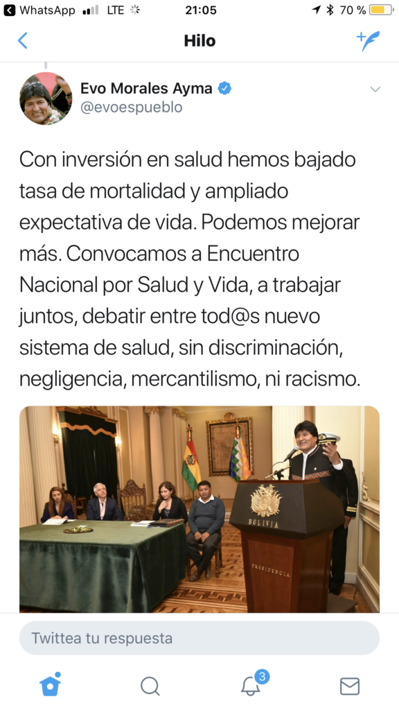 Tanto Evo Morales como la ministra de Salud de Bolivia, Ariana Campero, dieron cuenta en distintas oportunidades que la meta es lograr un sistema de salud gratuito. El 27 de diciembre de 2017, el mandatario del Palacio Quemado aseguró en su cuenta @evoespueblo: “Con inversión en salud hemos bajado tasa de mortalidad y ampliando expectativa de vida. Podemos mejorar más. Convocamos a Encuentro Nacional por Salud y Vida, a trabajar juntos, debatir entre tod@s nuevo sistema de salud, sin discriminación, negligencia, mercantilismo, ni racismo”. Sin embargo, todavía no es más que un proyecto.