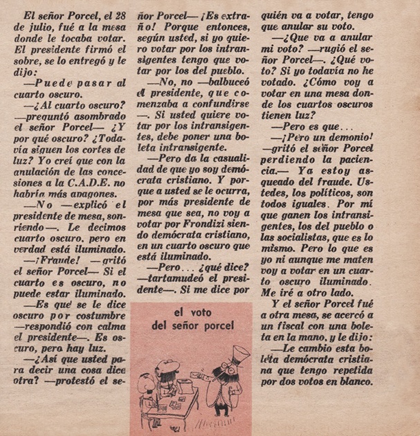 La cita corresponde a la crónica del voto del señor Porcel en la elección del 28 de julio de 1957 publicada por Landrú en Tía Vicenta.
