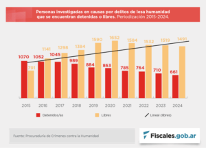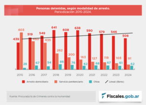 El altavoz Roberto Navarro anunció en El Pase que a pedido de Villarruel, Milei firmaría hoy el indulto de los condenados por Crímenes de Lesa Humanidad, afirmación que pese a no contar con fuentes ni desarrollo se reprodujo en varios portales. Otras versiones indicaban que se dispondría la prisión domiciliaria para todos los militares mayores de 70 años que estuvieran detenidos en establecimientos penitenciarios. Hasta la semana pasada habían sido condenados 1176 personas, absueltas 183, sobreseídas 104 y con falta de mérito 158. Este dato oficial del Ministerio Público desmiente que se trate de juicios populares cuya sentencia se conoce de antemano. Nadie entra condenado al tribunal. Entre 2015 y 2024, 1491 personas permanecieron en libertad, y sólo 661 fueron detenidas. De ellas, sólo 91 tienen residencia en el Servicio Penitenciario Federal y 508 ya gozan del arresto domiciliario, dispuesto por los jueces, que pueden hacerlo a partir de los 70 años, según lo contempla la ley de Ejecución Penal, sin referencia alguna al delito por el que se pronunció la condena. Hay 62 personas en otra situación no especificada (mayoritariamente alojados en Campo de Mayo).