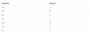 Y esta la nomenclatura de las notas, en inglés y en castellano.