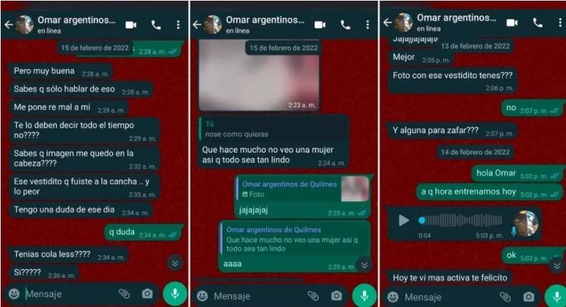 Omar Giménez envió expresiones como: “Estás más buena que comer dulce de leche con la cuchara”, a la vez que pedía fotos y videos íntimos. En otro chat, escribió: “¿Sabés qué imagen me quedó? Ese vestidito con el que fuiste a la cancha... y lo peor, tengo una duda. ¿Tenías colaless?”