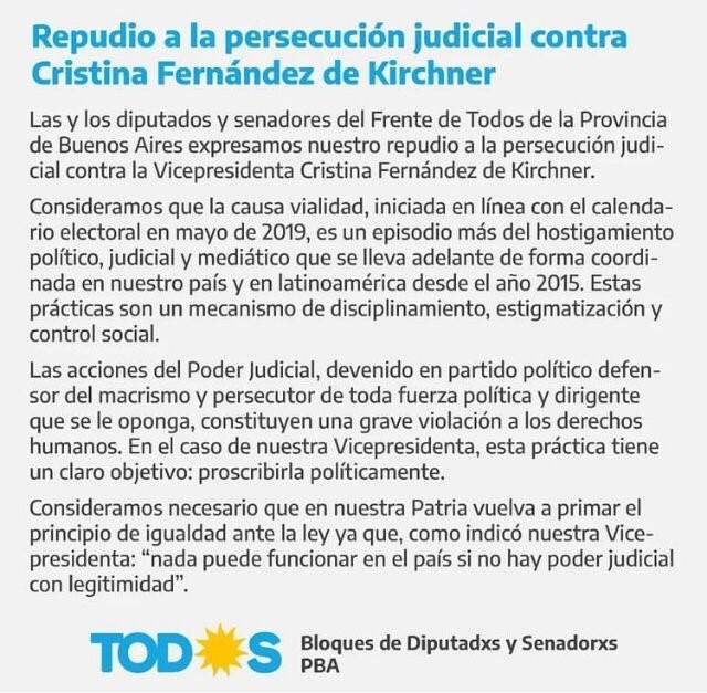 Desde la Legislatura bonaerense, los bloques oficialistas asociaron el inicio de la causa Vialidad a la campaña electoral de 2019, según lo consignaron en su comunicado de repudio al intento de proscripción: