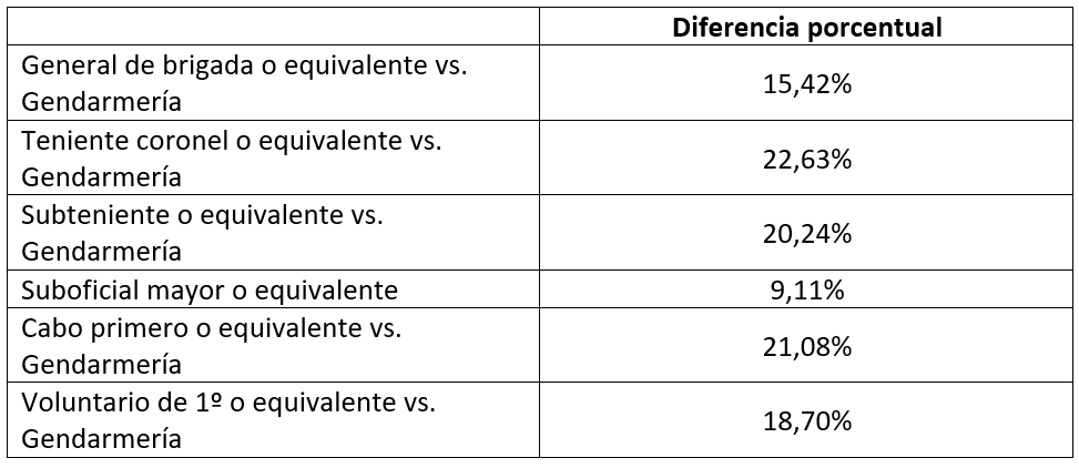 Sorprendentes logros de un gobierno que manifestaba el pasado 2 de abril su “firme convicción de fortalecer nuestro compromiso con la defensa de nuestra soberanía y el reconocimiento pleno a quienes la protegen”. Desde luego, un compromiso que no supone efectivizar las cuotas restantes de jerarquización y equiparación salarial con las fuerzas de seguridad fijadas por el gobierno anterior. Al 1º de diciembre de este año, los datos de esta asimetría son los que se muestran a continuación. Cabe aclarar que, con la Policía Federal, la diferencia es aún mayor.