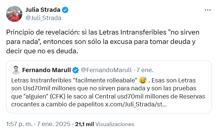Es curioso el hecho de que los economistas hoy libertarios han afirmado que las letras intransferibles “no sirven”, pero a los efectos de la toma del crédito con privados parecieran ser equivalentes a deuda externa.