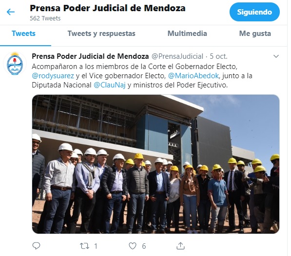 Mauricio Macrí recorrió parte de las obras construidas por Cartellone el fin de semana pasada, durante una de sus giras del tour de campaña. Estuvo en el polo judicial de Mendoza. Ahí habló, hizo su acto y se sacó fotos con tres integrantes de la Suprema Corte de Justicia local.
