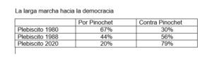 Luego de años de movilizaciones en los barrios populares, brutalmente reprimidas por los carabineros, que incluso quemaron vivos a jóvenes estudiantes, Pinochet convocó a un nuevo plebiscito en 1988, del que esperaba obtener un nuevo mandato hasta 1997. Aquel 67% se redujo al 44%, y el 30% de la oposición creció hasta el 56%. Pinochet debió convocar a elecciones presidenciales, con lo que comenzaron tres décadas de gobiernos electos, de la Concertación entre Democristianos y Socialistas durante los 16 años que van de 1990 a 2016, y entre el Socialismo y la derecha liberal desde entonces, con dos mandatos cada uno alternados entre Michelle Bachelet y Sebastián Piñera, porque en Chile no hay reelección directa. Pero Pinochet permaneció como jefe del Ejército hasta 1998 y como senador vitalicio desde entonces y hasta su detención en Londres por orden el juez español Baltasar Garzon a fines de ese año. Esa Constitución y las complementarias leyes de amarre aseguraron que la voluntad popular no se reflejara en los cuerpos electivos, que las FFAA tuvieran asegurado un amplio financiamiento en cualquier situación económica y la última palabra en cualquier conflicto de fondo.