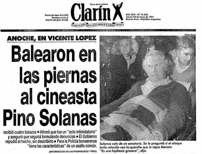 Los disparos que dieron en las extremidades inferiores de Solanas fueron media docena, de calibres 22 y 9 milímetros. Esa noche del 22 de mayo de 1991, al ser informado de que el Presidente Carlos Menem le enviaba a su médico para examinarlo, Pino lo hizo echar de la clínica. Siempre estuvo convencido de que los pistoleros respondían a la voluntad presidencial ya que el “callate la boca” estaba motivado en sus denuncias sobre los negocios con las Galerías Pacífico y la privatización de YPF.