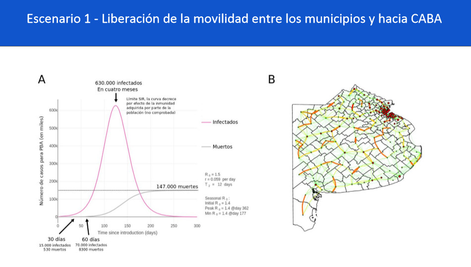 El escenario 1 es el peor: muestra la proyección con relajamiento del aislamiento social en Ciudad y en Provincia. En ese escenario se observa un pico en 20 días con 200 muertes por día. Y sin ningún tipo de intervención, en 4 meses tendrían un pico con más de 600.000 infectados.
