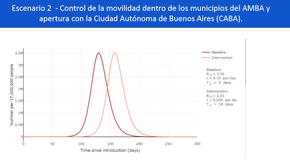 El escenario 2 es de aislamiento en la Provincia y relajamiento en Ciudad. Es el escenario de la semana previa a la última conferencia de Alberto Fernández. El pico se demoraría, y pasaría de 20 a 40 días con números de letalidad y virulencia como el primer escenario: 200 muertos por día con los mismos números aproximados del primer escenario pero con un pico que llegaría un mes mas tarde.