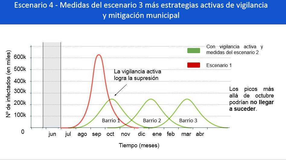 El cuarto escenario repite aislamiento de ambos lados pero incluye políticas de vigilancia activas como los dispositivos de testeos. Ese escenario no tiene picos y apagaría los brotes. Es el escenario al que busca sostener la provincia con una cuarentena que entiende que ya no tendrá picos.