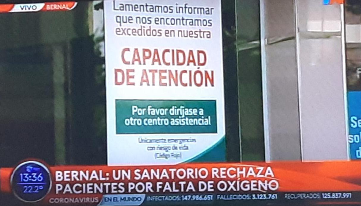 Un sanatorio de Bernal colocó un cartel en su ingreso que advertía: “Nos encontramos excedidos en nuestra capacidad de atención. Por favor diríjase a otro centro asistencial. Únicamente emergencia con riesgo de vida (código rojo)”.
