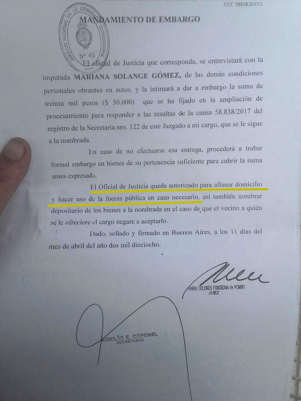 Como parte de los procedimientos de rutina cuando un causa es elevada a juicio, se notificó a Mariana Gómez que debía pagar 30.000 pesos por las costes y que, de no hacerlo, se procedería a realizar un embargo. Lo que a los ojos de la defensa resulta llamativo en la notificación que recibió Mariana es la línea que refiere a que “el Oficial de Justicia queda autorizado para allanar domicilio y hacer uso de la fuerza pública de ser necesario”.