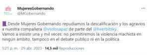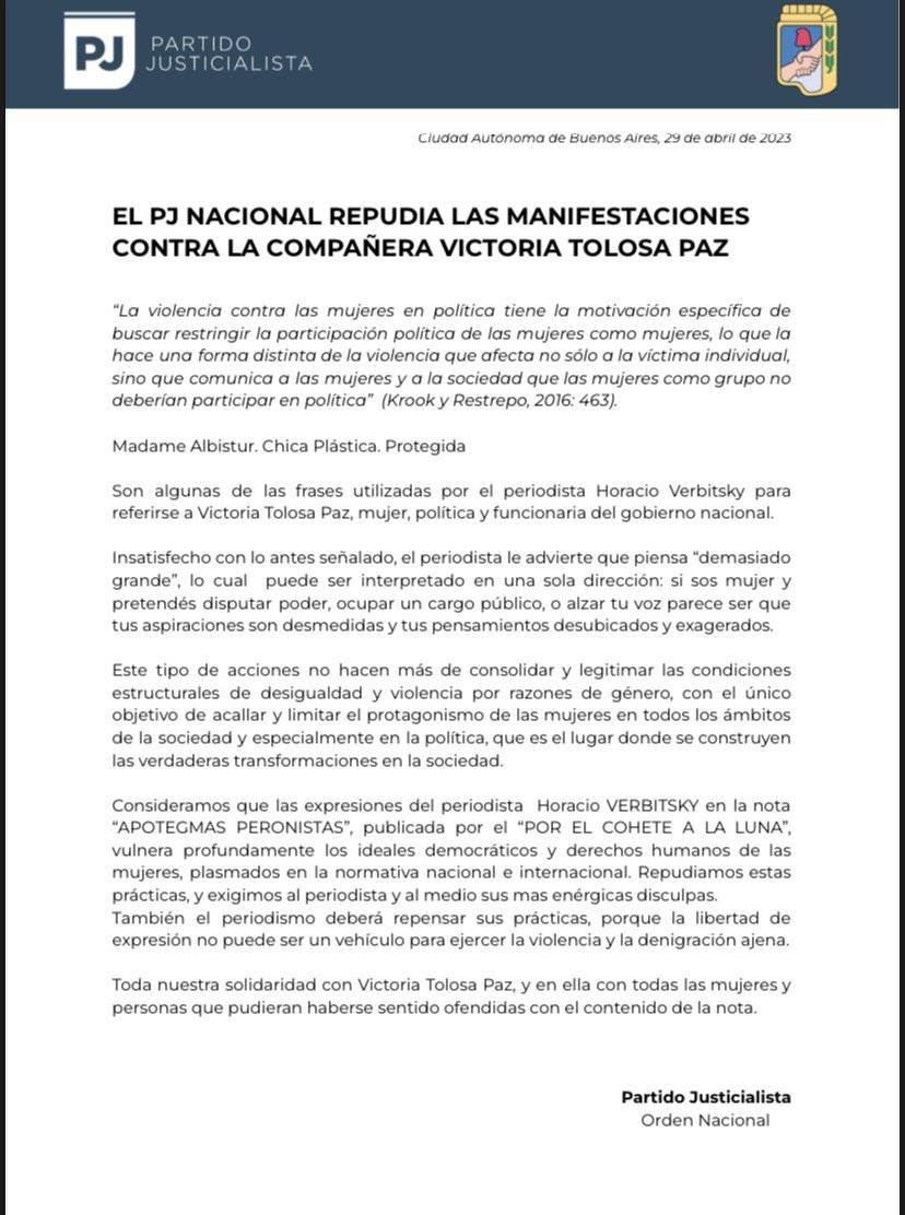 El insulto es un pobre instrumento de debate político. Lo practican quienes carecen de argumentos. No es mi estilo. Machirulo él, que responde por su esposa, como si fuera minusválida. Me tienen respeto por la misma razón que lo abuchearon a él y a Victoria Tolosa cuando llegaron al Teatro Argentino en la Plata. Suponer que la militancia ignora quién es quién expone su infundado complejo de superioridad.