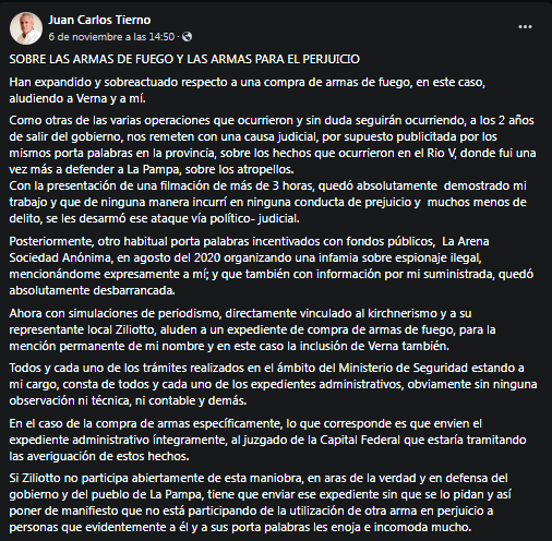 El 5 de noviembre, el diario La Arena confirmó que la compra de armas de la policía de Tierno a Fabricaciones Militares no había sido objetada por el Tribunal de Cuentas pampeano. La presidenta de ese organismo de contralor es la contadora María Alejandra MacAllister, hermana del ex futbolista que en 2019 perdió la interna con el radicalismo y posible candidata a vicegobernadora por el PRO en las elecciones del año próximo.