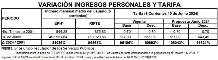 Ahora, el Decreto 147/24, puesto a consideración en la audiencia pública, propone una tarifa técnica de 859,07 pesos y una actualización de las tarifas al usuario en tres tramos: