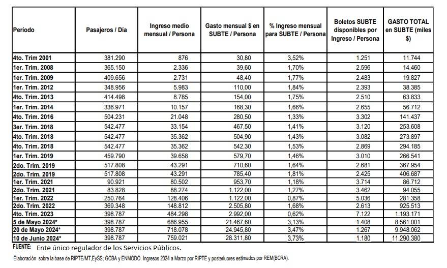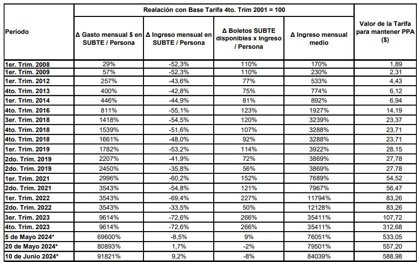 El porcentaje del ingreso de los usuarios destinados al subte, considerando sus ingresos medios mensuales, llegará a sus niveles históricos (3,73%) superando los valores de los últimos 20 años. Y se pasará del 0,62% al 3,73% con este aumento en un solo mes.