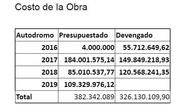 Lo presupuestado es lo estipulado por el Ejecutivo para el Predio Ferial y Autódromo que va a gastar para el año entrante, es lo que pasa por el Concejo Deliberante. Lo Devengado, es lo efectivamente gastado.