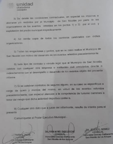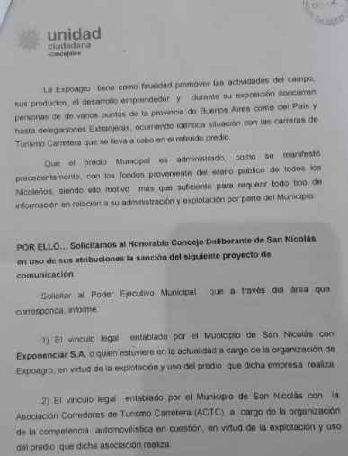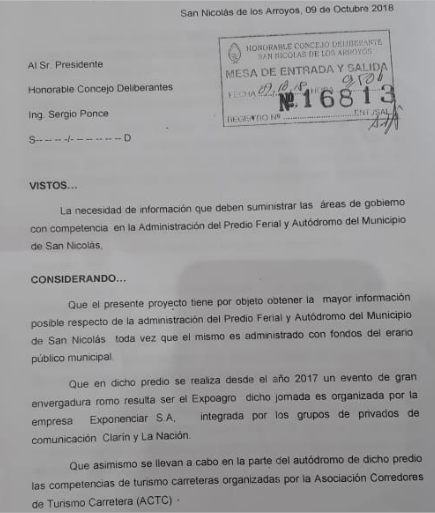 Los tres Concejales de Unidad Ciudadana de San Nicolás habían solicitado el año pasado en el mes de octubre información sobre las formas de contrataciones que realizan las empresas Exponenciar S.A (sello de Clarín y La Nación, organizadora de Expoagro) y ACTC y Super TC 2000 (Carburando) sobre el predio ferial donde también funciona un autódromo. Desde ese bloque se preguntaban y preguntan: ¿cuáles son los beneficios económicos para la ciudad por estos convenios y cuál es el límite establecido con las empresas entre intervenciones públicas y privadas? A pesar que el expediente contaba con un despacho favorable de comisión para ser votado en el recinto, el pedido de informe fue rechazado por el bloque oficialista de Cambiemos. Los ediles solicitaban información sobre: