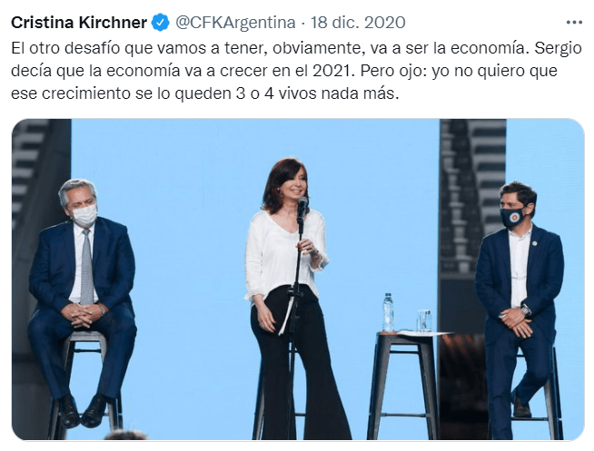 Lograron así instalar una idea falsa que nadie rebatió con la precisión que el tema ameritaba: la explicación del cierre de las exportaciones a la carne vacuna. Fue Cristina Fernández de Kirchner durante el cierre de la campaña electoral nacional del Frente de Todos en Tecnópolis quien se refirió al tema y expresó con ironía: “Así que todas las vacas que se iban en exportación eran vacas viejas. Me parece que en el campo tenemos un geriátrico en lugar de producción vacuna”, dijo. “El 75% de lo que se exportaba en carne se lo llevaba China, hasta que Alberto tomó la medida. El 22,5% de la producción nacional vacuna. Por eso aumentaba todas las semanas la carne”, señaló.