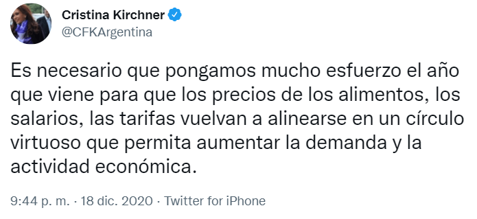 Cuando en diciembre pasado la Vicepresidenta dijo que en 2021 tenían que alinearse precios y salarios tenía en claro que era un problema que se debía abordar y resolver. “Yo no quiero que ese crecimiento (del país) se lo queden 3 o 4 vivos nada más”, dijo, pero eso fue lo que ocurrió. Y es una de las explicaciones del resultado de las Primarias Abiertas, Simultáneas y Obligatorias (PASO), donde el Frente de Todos no obtuvo el resultado que esperaba. “Me parece que hay que alinear salarios y jubilaciones, precios –sobre todo los de los alimentos– y tarifas”, había expresado Cristina Fernández de Kirchner. Lo realizado no alcanzó.