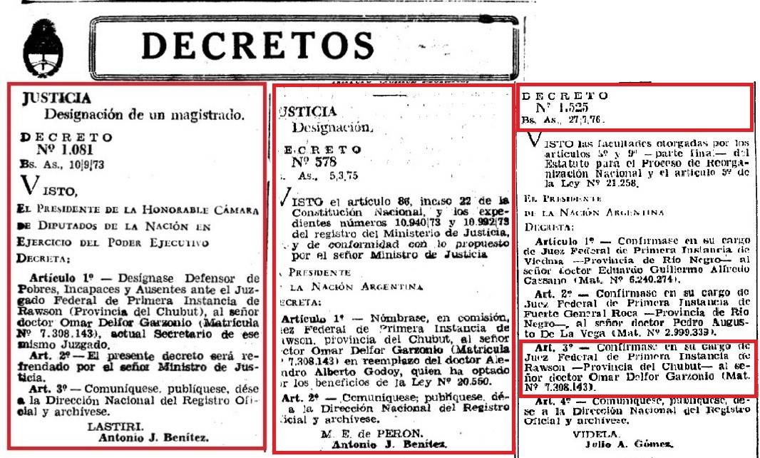 Hace 13 años ya, Parcio de Seleme dijo que de la lectura de la causa 35/146 y de la que ella instruía pero “fundamentalmente de las declaraciones testimoniales de las víctimas prestadas a lo largo de todo el proceso, surge con meridiana claridad la connivencia y complicidad del entonces Juez Federal de Rawson Omar Garzonio (hoy fallecido) con muchas de las personas aquí imputadas, y como instrumento necesario con el que se intentó en esos años no sólo justificar sino fundamentalmente ocultar bajo un halo de legalidad a partir de este proceso los delitos de lesa humanidad y violaciones sistemáticas a derechos humanos de las victimas sometidas a proceso por Garzonio”.