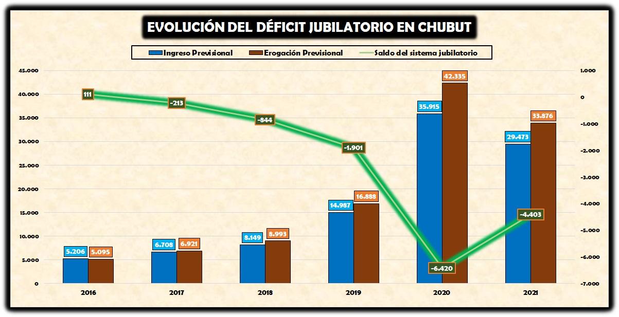 “En 2016 el sistema previsional de Chubut no tenía déficit y ese fue el último año en que los ingresos previsionales fueron mayores a los egresos (…) con un saldo positivo de 111 millones de pesos. A partir del 2017 comenzó a forjarse el déficit de la caja de jubilaciones provincial y fue creciendo a ritmos meteóricos, pasando de 213 millones de pesos en ese año, para luego ascender a 844 millones en 2018, a 1.901 millones en 2019, a 6.420 millones en 2020 y ubicarse en 4.403 millones de pesos en 2021, que es el último dato disponible”, según el análisis realizado por Marcelo García y publicado por Sitrajuch. Precisó que “el abultado incremento del déficit que se dio en 2020 fue producto del brutal ajuste aplicado en plena pandemia sobre los salarios de los empleados públicos activos, situación que tuvo paralelismo con lo sucedido con el ajuste del 2018 cuando el déficit se multiplicó por diez en medio del tremendo ajuste aplicado sobre los salarios estatales”.