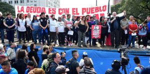 La zona del Congreso, el Obelisco y la 9 de Julio fue copada por oleadas de manifestantes de las organizaciones sociales que marcharon hacia el Ministerio de Desarrollo Social reclamando una urgente declaración de la Emergencia Social que debe traducirse en aumento a los planes sociales, jubilaciones, asignaciones de partidas a los comedores populares y AUH. La enorme convocatoria fue calculada en más de 200.000 personas. La crisis va tomando dimensiones de catástrofe social y los movimientos sociales buscan contener desbordes para evitar saqueos y las consiguientes secuelas de violencia y muerte que conlleva la represión a los desesperados. Un gobierno paralizado y en modo campaña electoral no atina a dar ninguna respuesta. Tres meses de espera es un breve lapso en términos institucionales, pero es una eternidad cuando se trata de mayores y niños que no tienen para comer. Durante la marcha, Roberto Baradel se refirió al gobierno de Macri: “Algunos dicen que fracasó, yo creo que fue exitoso con el sector que representa”. El secretario general de Suteba dialogó con Radio Perfil durante la marcha de organizaciones sociales en el centro porteño. “El 7 de septiembre el Gobierno debería arrancar con la campaña, ahora tendría que estar gobernando y hacerse cargo de la crisis que generó; es una gran irresponsabilidad del Presidente Macri”, dijo. Además agregó que el resultado de octubre “es prácticamente irreversible”.
