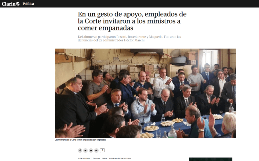 En la foto que no salió publicada en ese medio se pueden ver a varios sujetos: Robles está recortado a la derecha. Apenas detrás de Maqueda, se encuentra el vocero de Rosenkrantz, Ariel Neuman. A su lado, Sergio Romero –hombre de Piumato–, que organizó la gestión de las empanadas con Robles. También aparece el director de Mantenimiento, Mario Alarcón, con salario de juez de instrucción y también pertenencia al gremio de Piumato. Estuvo en la Comisión de Juicio Político y admitió que la inundación que tuvo lugar tras el escándalo de los chats ventilados entre Robles y el ex ministro de Seguridad porteño, Marcelo D'Alessandro, afectó el despacho de Robles. Aquí ambas fotos.