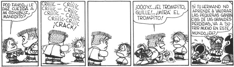 Para los clarineros ningún verbo en potencial es excesivo, ninguna fuente es necesaria, ninguna realidad por flagrante que sea carece de potencial para ser manipulada. A mediano plazo, las ciencias sociales crearán cátedra con la saga de Clarín vendiendo la crisis como algo sexy ("Vivir en monoambiente es la última moda", "Protestar es malo para la salud": esa clase de producciones 'periodísticas') y también con los titulares del Periodismo Manolito, a partir de aquel episodio de Mafalda en que el galleguito rompe el auto a cuerda de Guille y trata de convencerlo de que jugar con sus despojos es bárbaro. "Si tu hermano no aprende a valorar las pequeñas ganancias de las grandes pérdidas —dice Manolito a Mafalda—, va a sufrir mucho en este mundo, ¿eh?" Lo que nosotros deberíamos valorar, en este caso, serían las presuntas ventajas de que ya no exista periodismo en los medios masivos sino soma mental, alimento conceptual predigerido que nos dice qué debemos pensar aun cuando no sepamos por qué.