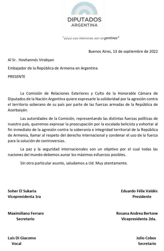 La Comisión de Relaciones Exteriores de la Cámara de Diputados expresó su “solidaridad por la agresión sufrida contra el territorio soberano por parte de Azerbaiyán”. Al pie de la carta dirigida al embajador armenio Hovhannés Virabyan, compartieron sus firmas el diplomático Eduardo Valdés (Frente de Todos), en su condición de presidente de la Comisión, con la de su vice, la libanesa Soher El Sukaria (PRO), máster en Relaciones Internacionales.