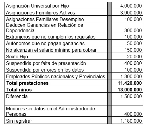 Según datos de ANSES de octubre de 2019, estaban en condiciones de percibir Asignaciones Familiares o AUH 13 millones de niños y adolescentes, pero conforme el cuadro adjunto, también elaborado por ANSES, se encontraban alcanzados por algún beneficio o cobertura 11.420.000 personas, por lo que quedan más de 1,5 millones que no reciben nada y no están identificados.