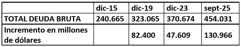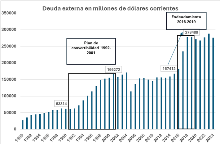 Al fenómeno de la deuda externa se le sumó progresivamente el de la deuda interna, no solo explicada por el déficit fiscal por exceso de gasto (supuestamente superfluo e ineficiente), sino también por el nexo entre deuda externa e interna a través del llamado carry trade y la imposibilidad que ha tenido la Argentina de evitar la fuga de capitales, siempre implícita en este supuesto mecanismo de estabilización fallida. Así, cuando ambos valores de deuda se suman convertidos en dólares, se tiene lo que muestra el cuadro siguiente.