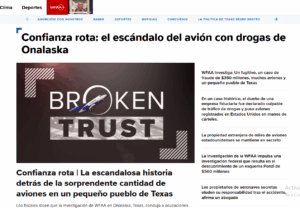 Dije en una nota del año pasado que esas matrículas sólo se otorgan luego de un proceso exhaustivo de inspección. Tal vez no sea así. Una investigación periodística de Tanya Eiserer en la televisora texana WFAA, filial de la cadena ABC, detectó que en el pequeño pueblo de Onalaska, con 3.000 habitantes y sin aeropuerto, se habían registrado un millar de aeronaves, sin que al Ministerio de Transporte le llamara la atención. El informe se llama Confianza Rota, y se presentó así, en junio de 2023.