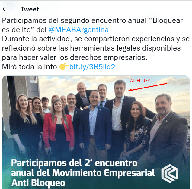 La empresa Rey Distribución, de la ciudad San Pedro, denunció penalmente a sindicalistas en 2021. El viernes 8 de abril de este año logró que el Poder Judicial dictara las prisiones preventivas del secretario general del Sindicato de Choferes de Camiones de la seccional San Nicolás, Maximiliano Cabaleyro, y del delegado del gremio de la ciudad de San Pedro, Fernando Espíndola, por los delitos de turbación de la posesión, extorsión y extorsión en grado de tentativa y coacción. Ariel Rey y su hermano Gustavo, junto a su padre, son propietarios de la empresa distribuidora de alimentos que lleva su apellido. Ariel Rey forma parte del MEABA, fuerza de choque contra la protesta sindical, motorizada y referenciada en el PRO. La abogada Florencia Arietto es su cara visible, pero Patricia Bullrich fue la impulsora.
