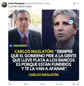 - Tampoco se conmovieron los tenedores de dólares con la plegaria ministerial para que los vuelquen al circuito productivo a través de los bancos. Los argendólares siguen en el colchón y el riesgo país prohíbe asomarse a los mercados voluntarios internacionales. El que salió fue el funcionario que estaba negociando esos préstamos usurarios. Es un perfecto círculo vicioso, porque si esas perspectivas no se afirman, los inversores mirarán hacia otros rumbos. Así lo ven especialistas que impulsaron a Milei hacia la presidencia.