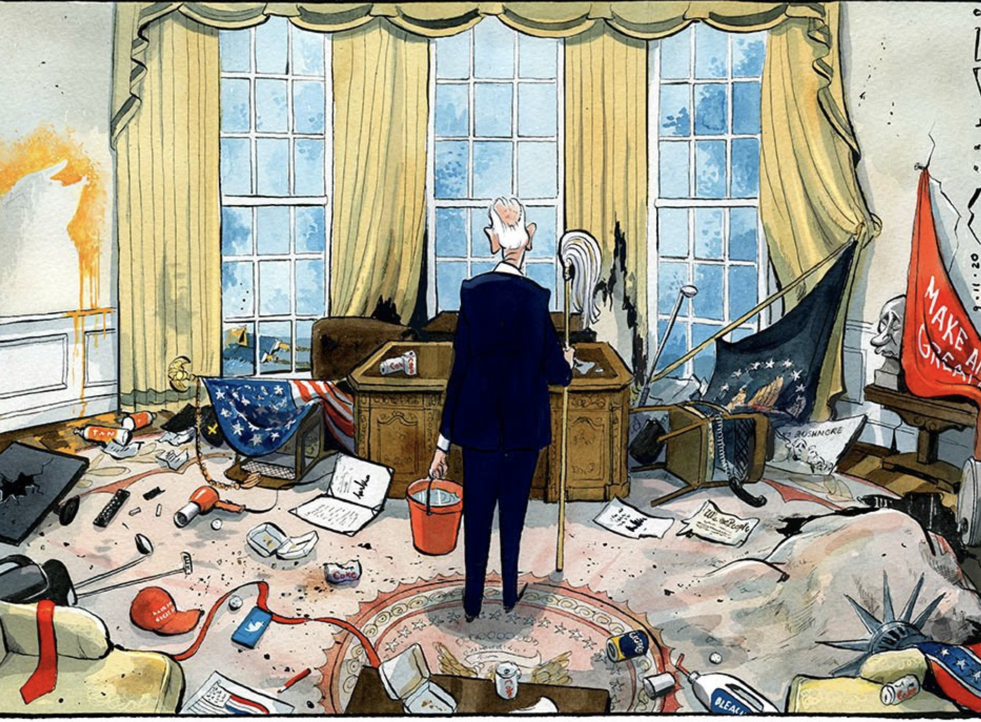 Mientras su Vicepresidente se ajustaba el nudo de la corbata para acudir al traspaso de mando, Trump caminaba taciturno hacia un helicóptero junto a su esposa Melania, un verdadero maniquí de hielo y quizás la única persona inconmovible en este entuerto. En los parlantes sonaba Frank Sinatra cantando A mi manera. Como el protagonista de la canción, quien “enfrenta el telón final”, Trump se mantuvo firme, encaró todo a su modo y se va sin arrepentimientos. Una canción inolvidable, y una presidencia ídem (por razones muy distintas). A Trump finalmente se le pasó de hervor el denso caldo que venía cocinando, se le derramó y terminó quemado. Si no hubiera entrado en su loca espiral post-electoral, hubiera tenido una chance. Pero no. Se fue con el menor índice de popularidad histórico de un Presidente estadounidense, el 34%. Podría decirse que estos últimos dos meses fueron una desgracia con suerte para los Estados Unidos.