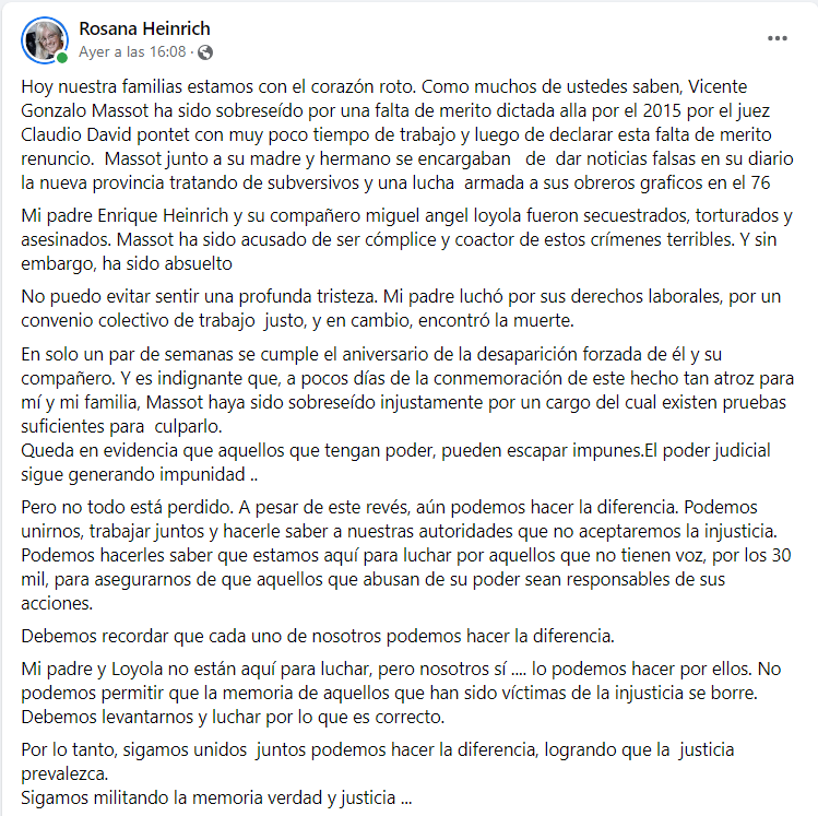 Rosana Heinrich, hija de Enrique, expresó su desazón en un escrito que compartió la regional Bahía Blanca de H.I.J.O.S.:
