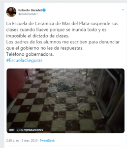 Zulema Casanoba secretaria de salud y condiciones de medioambiente y de trabajo de Suteba General Pueyrredón, expresa que desde que gobierna Cambiemos a nivel nacional, provincial y local “la inversión en educación e infraestructura es cada vez menor”. El relevamiento de riesgos emprendido por el gremio indicó que en más de 70 escuelas del distrito no se había realizado lo que el protocolo de la Comisión Mixta de Salud y Seguridad en el Empleo Público establece en relación a agua potable, gas, electricidad y edificios seguros. Durante una jornada en el Concejo Deliberante, se expuso la grave situación de infraestructura, pero nadie respondió. En febrero se exigió que el Ministerio de Trabajo inspeccionara las más de 50 escuelas que no estaban en condiciones, e impactaban en una matrícula de alrededor de 17.000 alumnos. En marzo volvieron a solicitar un plan de obras y formar parte de la Unidad de Gestión Distrital. Pero nunca fueron convocados a reuniones.