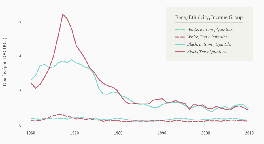 Si intentamos compararlos con datos más antiguos, como por ejemplo con los años ‘60, las cifras del National Center for Health Statistics (NCHS) tienen un subregistro “masivo”. Durante esos años, el NCHS clasificaba estas muertes bajo el término “Intervención Legal”, que incluyen “lesiones infligidas por la policía u otros agentes encargados de hacer cumplir la ley, incluidos los militares en servicio, durante el arresto o el intento de arrestar a infractores de la ley, la represión de disturbios, el mantenimiento del orden y otras acciones legales”. Hecha esta advertencia, Nancy Krieger, Mathew V. Kiang, Jarvis T. Chen y Pamela D. Waterman han reconstruido las cifras solamente para hombres y entre 1960 y 2010: