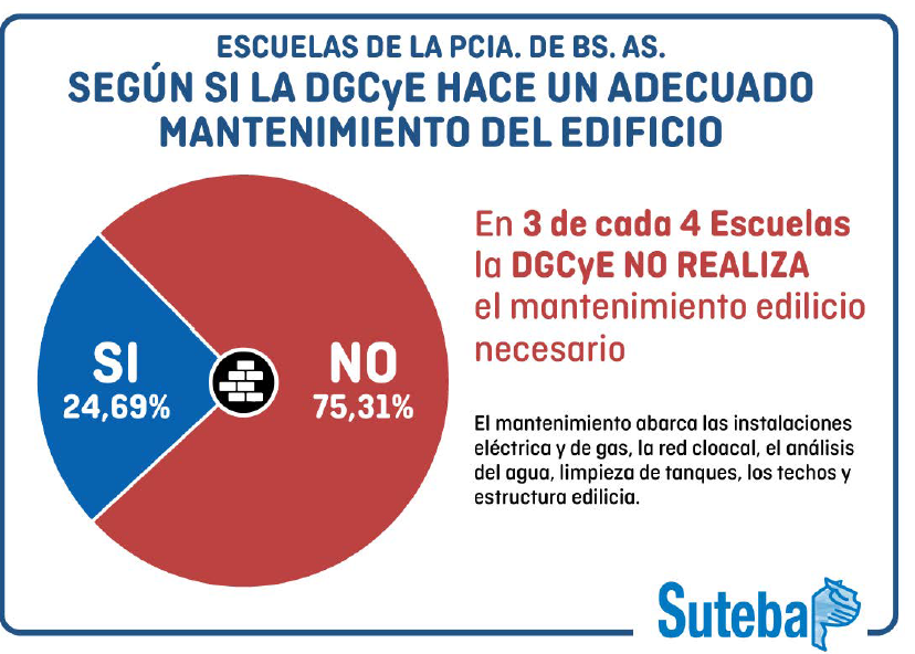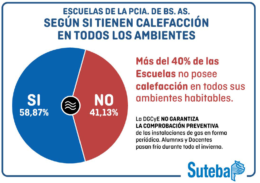 El Sindicato Unificado de Trabajadores de la Educación de la provincia de Buenos Aires (SUTEBA) brindó el jueves una conferencia de prensa detallando la situación de las escuelas de diferentes distritos que se encuentran sin la calefacción correspondiente. “Hoy venimos a denunciar que hay más de 500.000 chicos afectados por falta de calefacción, por el tema de comedores escolares, por la falta de cocinas, por turnos reducidos, por suspensión de clases. Le reclamamos a la gobernadora María Eugenia Vidal y al Director General de Cultura y Educación una respuesta urgente a esta situación gravísima”, señaló Roberto Baradel, secretario general de SUTEBA.