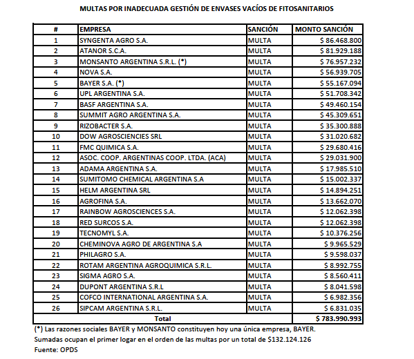 La nómina de firmas multadas toma en cuenta a aquellas que incumplieron el retorno de más de 100.000 unidades e incluye a numerosas transnacionales del ramo. La más cuantiosa supone un monto superior a los 86 millones de pesos y se aplicó sobre Syngenta. Aunque si se considera a Bayer y Monsanto como un único conglomerado mundial, sus incumplimientos trepan al primer lugar. Atanor, BASF, Dow y Dupont también forman parte de la lista, como ilustra este cuadro:
