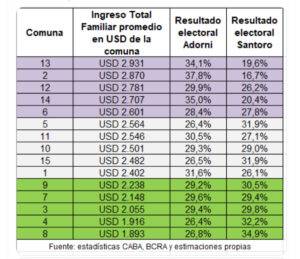 - En cambio, los sectores que gastan todo en comida, ropa, escuela y demás, que no compran un sólo dólar, votaron mayoritariamente a Santoro (Santoro 31,4% vs Adorni 28,3% en las Comunas 9, 7, 3, 4, 8). El ingreso total familiar promedio en dólares de estas comunas no llega a USD 2.050.