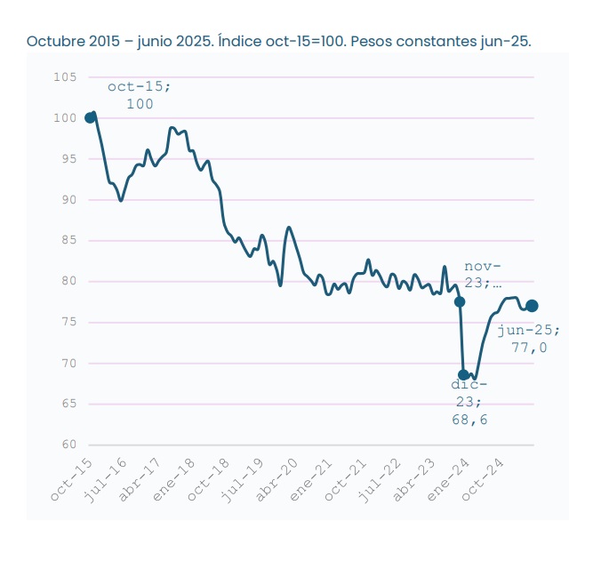 Los cómputos oficiales dibujan las pendientes por las que desbarrancó el salario formal privado en los comienzos de los gobiernos de Mauricio Macri y Milei. Las recuperaciones posteriores nunca alcanzan los pisos perdidos.