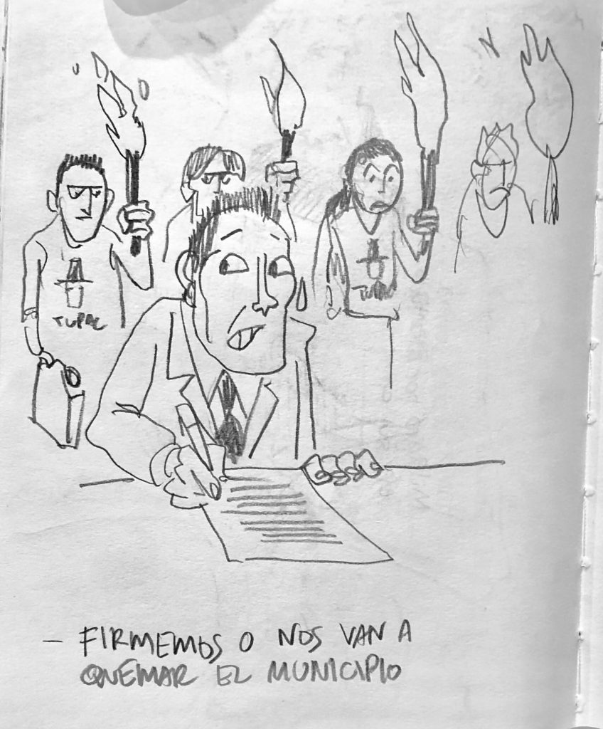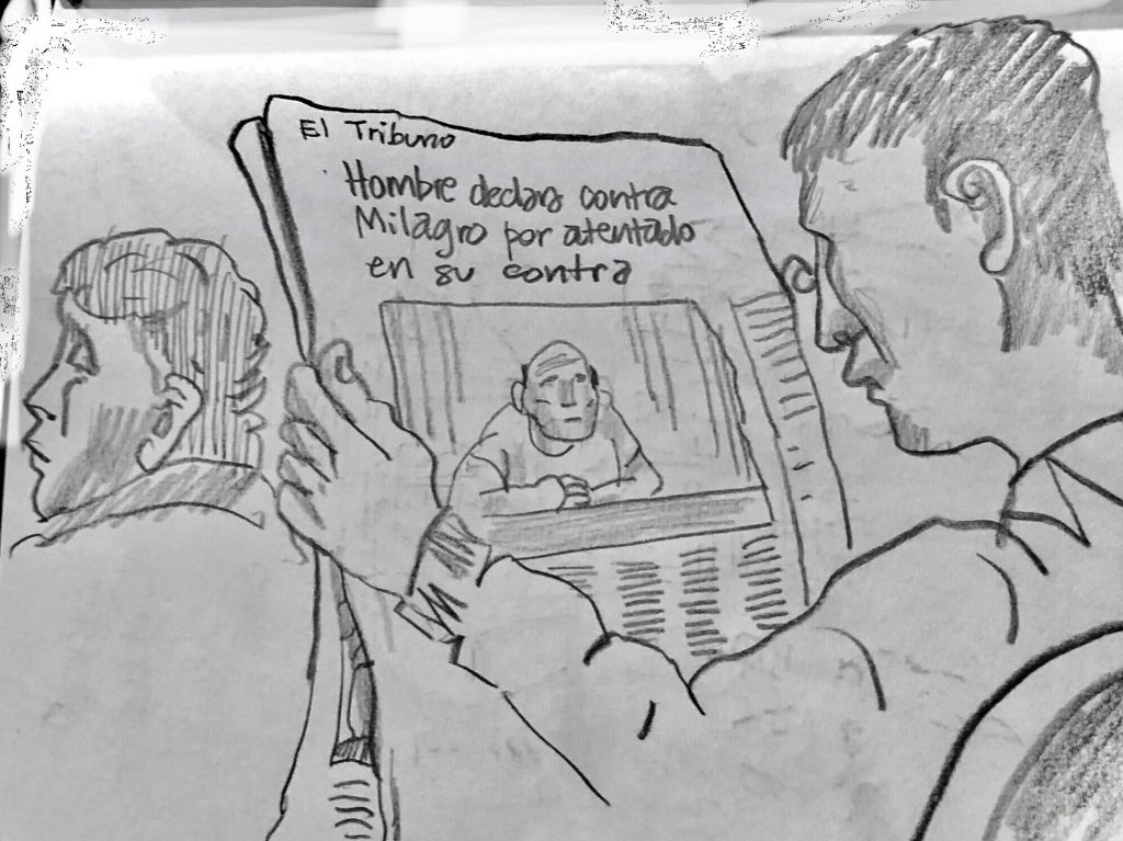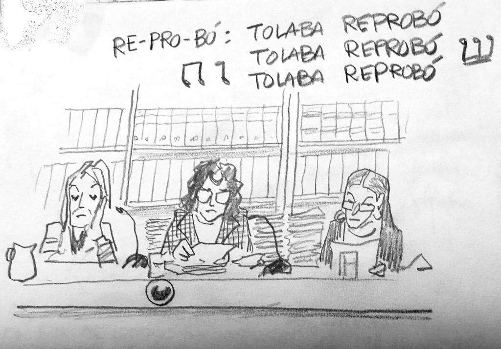 Esta vez llega con un papel A4 con un retrato apenas caricaturesco de la presidenta del tribunal, María Alejandra Tolaba. El papel dice: "Jueza Tolaba: reprobada".