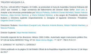 Treater tuvo dos etapas. Una, en el origen de 2012 con gente de Neuquén, de la mano de José Leis que venía del rubro de los basurales industriales. En el lugar hay otras dos empresas del rubro: Comarsa, y un desprendimiento llamado Indarsa. Treater también fue desprendimiento de Comarsa porque Leis venía de ahí. Comarsa e Indarsa primero operaron en el parque industrial de Neuquén con desechos convencionales y luego abrieron una planta en Añelo, a hora y media de Neuquén donde todo crece con una población que en pocos años pasó de 2 a 5.000 habitantes estables, otros 5.000 temporarios y otros 5.000 que van y vuelven a diario de Neuquén. Leis y sus hijos pusieron conocimiento y fuerza de trabajo, y un financista de Corrientes el capital y las relaciones políticas en tiempos de Sapag. Las deudas y los préstamos crecieron. Y en 2015 entraron en escena tres amigos: Marcos Podestá, Nestor Fabricio Martínez y Alejo Hernán Martínez. Venían de la industria de las droguerías. Le habían prestado al financista, no pudieron cobrar y Treater les ofreció acciones. Al comienzo se quedaron con el 51 por ciento. Podestá fue designado presidente y los dos Martínez, parte del directorio, según el Boletín Oficial 33145 del 8 de junio de 2015. Sanearon. Ordenaron. Crecieron. Sacaron al financista. Le dieron un 10 por ciento a los hijos de Leis luego de la muerte del padre, y se quedaron con cerca del 90 por ciento. En marzo de 2017, comenzó la otra historia. Marcos Podestá dejó la presidencia, se quedó con un lugar en el directorio y le dio la presidencia a Cenzón, según el Boletín Oficial del 12 de mayo de 2017.