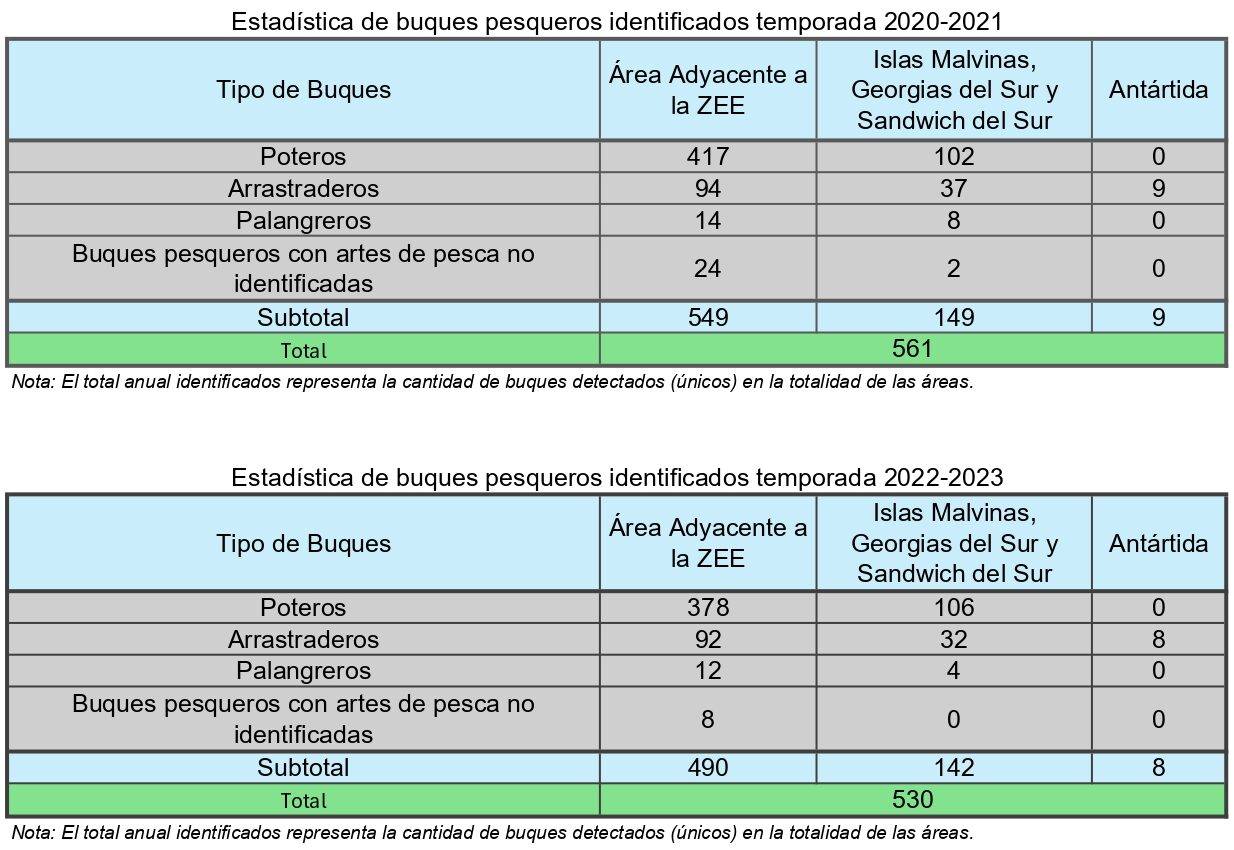 Las siguientes tablas muestran la ubicación y tipo de los buques pesqueros identificados por nuestro país.