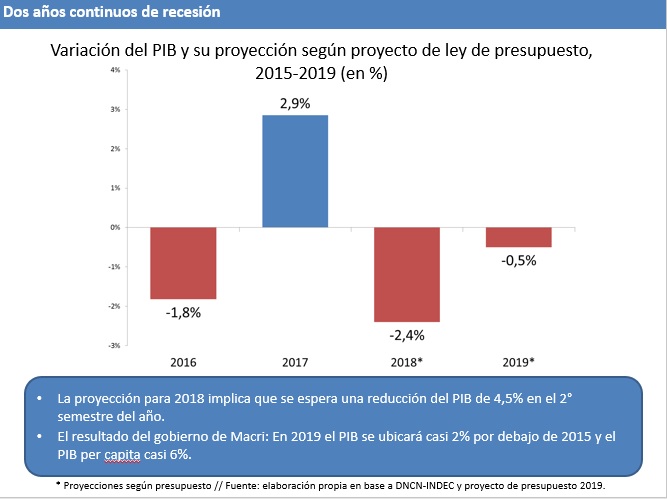 Aún si el presupuesto fuera más aproximado a la realidad que el cálculo del FMI, esas caídas tan significativas en el consumo y el gasto público harán que la economía vuelva a estar en recesión con el consiguiente panorama muy negativo en el mercado laboral, con menos empleo y pérdidas de poder adquisitivo en los ingresos. Hay que remontarse a 2001-2002 para encontrar que la economía retrocede dos años seguidos. Esta retracción implicaría que en 2019 el PIB quedará 2% debajo del nivel de 2015 y el PIB per cápita será 6% menor.