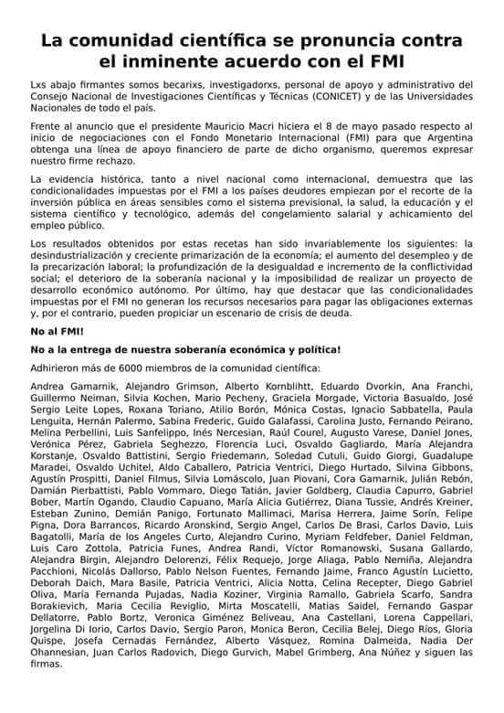 Frente al anuncio que el presidente Mauricio Macri hiciera el 8 de mayo pasado respecto al inicio de negociaciones con el Fondo Monetario Internacional (FMI) para que Argentina obtenga una línea de apoyo financiero de parte de dicho organismo, queremos expresar nuestro firme rechazo.